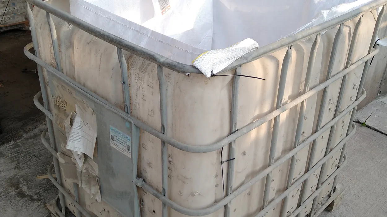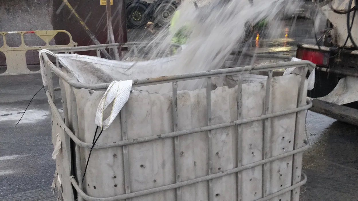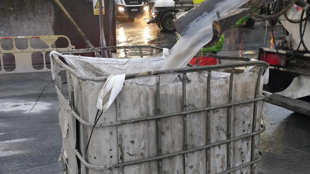 Er wordt een zeefsysteem gecreëerd door middel van een big bag met gaten, geplaatst in een groot plastic vat (IBC). Zo kunnen de kunstvezels worden gescheiden van het cementslib bij de schoonmaak van de mengvrachtwagenkuip.