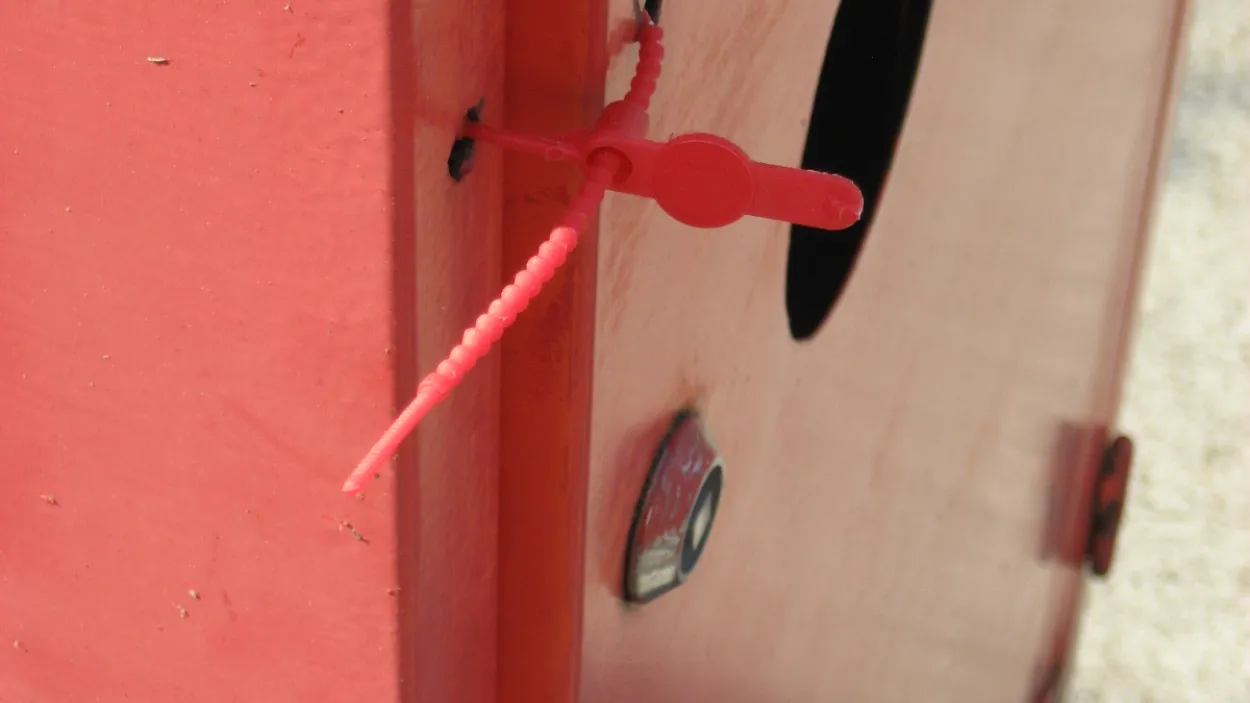 Verzegeling van kasten voor brandweermateriaal en antivervuilingskits d.m.v. kabelbinders om aan te geven dat ze gecontroleerd en volledig zijn